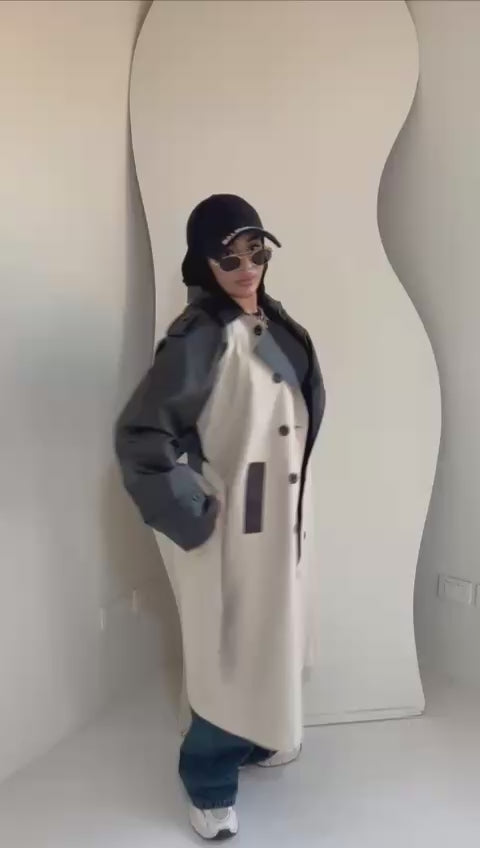 ترنش طويل بتصميم مزدوج بين الجلد والجبردين، بستايل عصري يديك دفء وأناقة في نفس الوقت